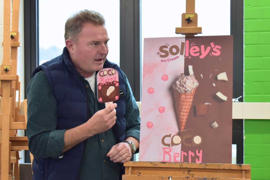 After visiting the company earlier in the academic year, students were set the challenge of developing a brand-new flavour alongside a complete campaign. This included brand identity, a social media post, a promotional poster, and even an ice cream “stabber” to be displayed in Solley’s parlour.